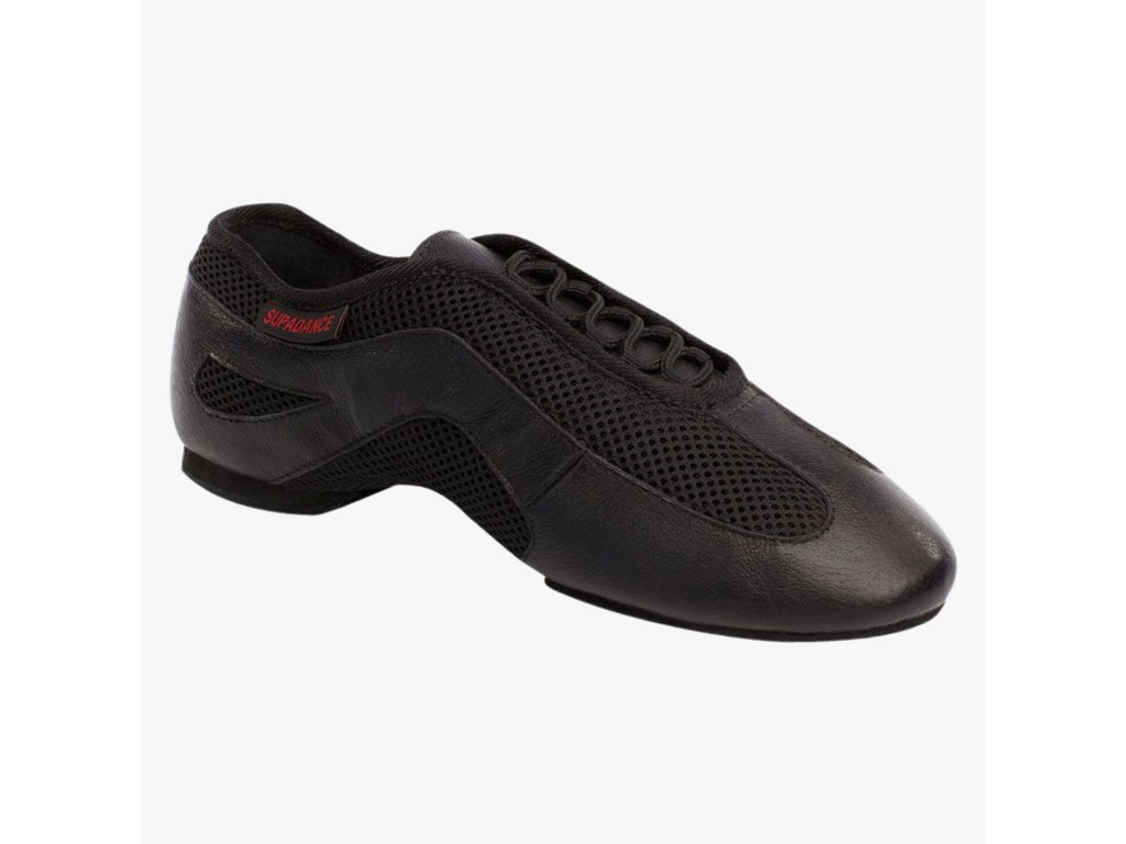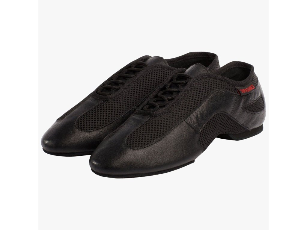 Tréninková taneční, jazzová a cvičební obuv, vyrobená z černé kůže a síťoviny, dělená podrážka. Černé kožené boty s nastavitelnými tkaničkami. Nový stylový design, velmi měkké a pružné. Prodyšné po celém svršku. Semišová dělená podrážka. Pokud máte "poloviční velikost", vždy přejděte na větší velikost